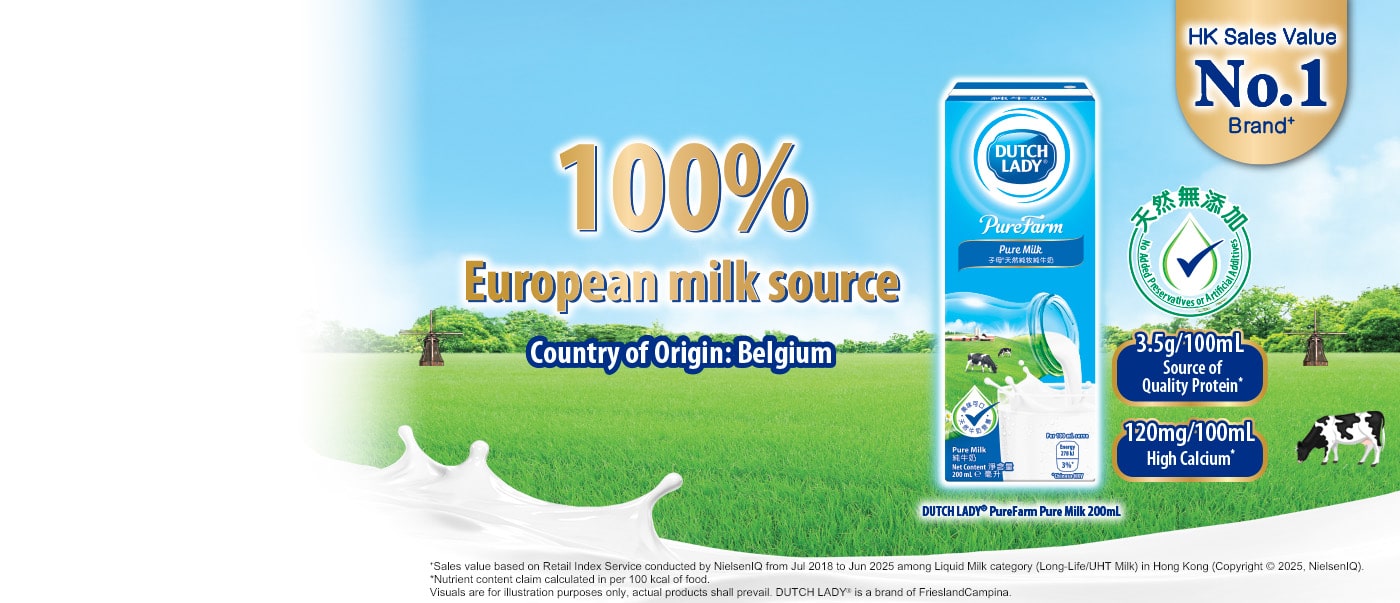 With premium source of 100% fresh milk originated from Europe, DUTCH LADY® PureFarm Pure Milk is rich, smooth, delicious and healthy. Free from added preservatives or artificial additives, it offers a safe and enjoyable experience.