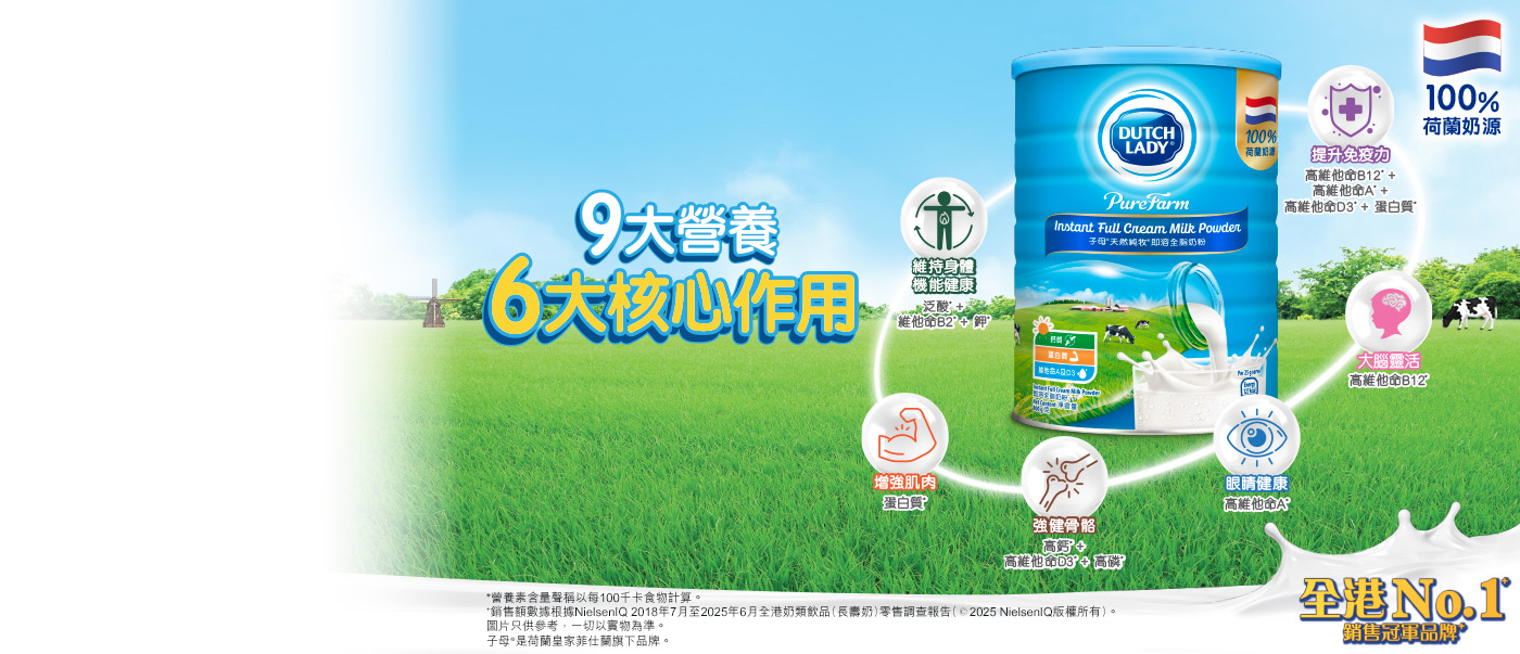 100%荷蘭奶源, 藴含9大營養、6大核心作用。